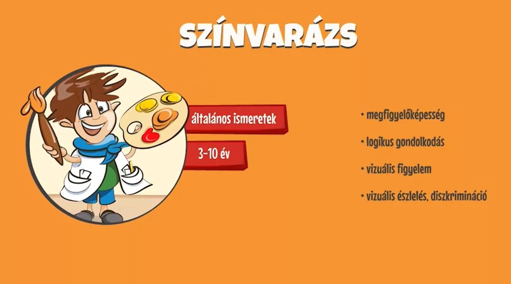 A színvarázs digitális tananyag segítségével az óvodáskorú gyermekek a színek varázslatos világát ismerhetik meg. A gyermekek színészlelése, színfelismerése fejleszthető könnyed, játékos formában. A színvarázslások mellett a hozzájuk kapcsolódó forma felismerése, felületének színezése siker és élmény a gyermekek számára. A program előnye, hogy a gyermekek kéz dominanciájának megfelelően jobb, illetve balkezes változat is beállítható. A Petői alapelvek szerint! A Pető András Főiskola szakértőivel fejlesztve.