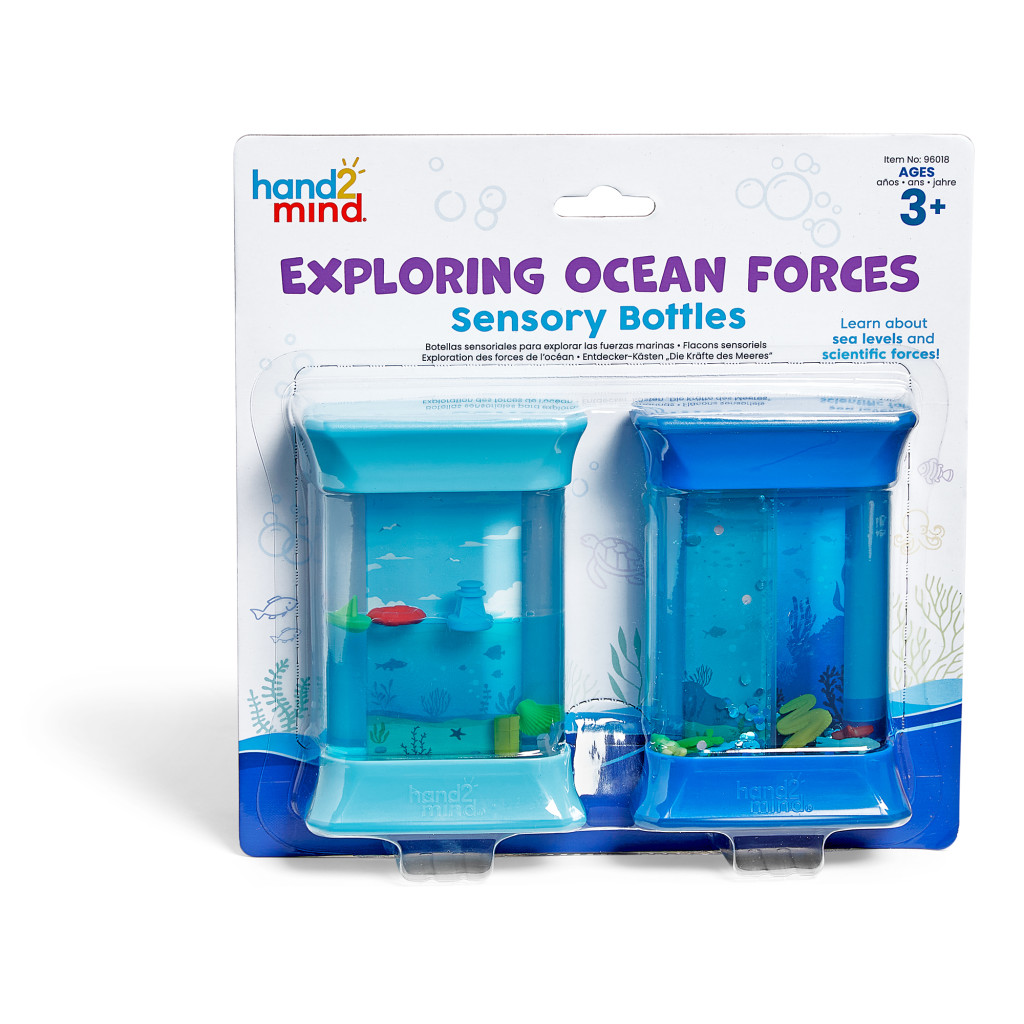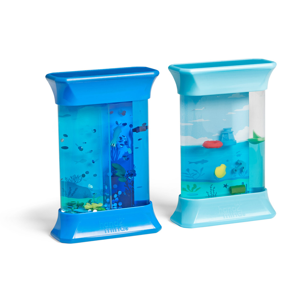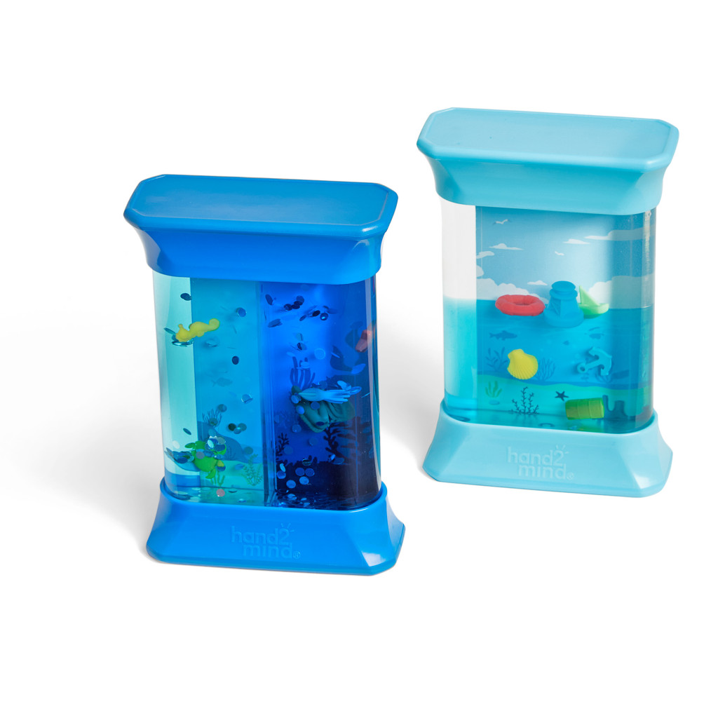 Ez a látványos, két darabból álló készlet folyadékkal és különböző sűrűségű, tengeri témájú elemekkel van feltöltve, amelyek mozgásba lendülnek, amikor a gyerekek megbillentik vagy fejjel lefelé fordítják az üvegeket.