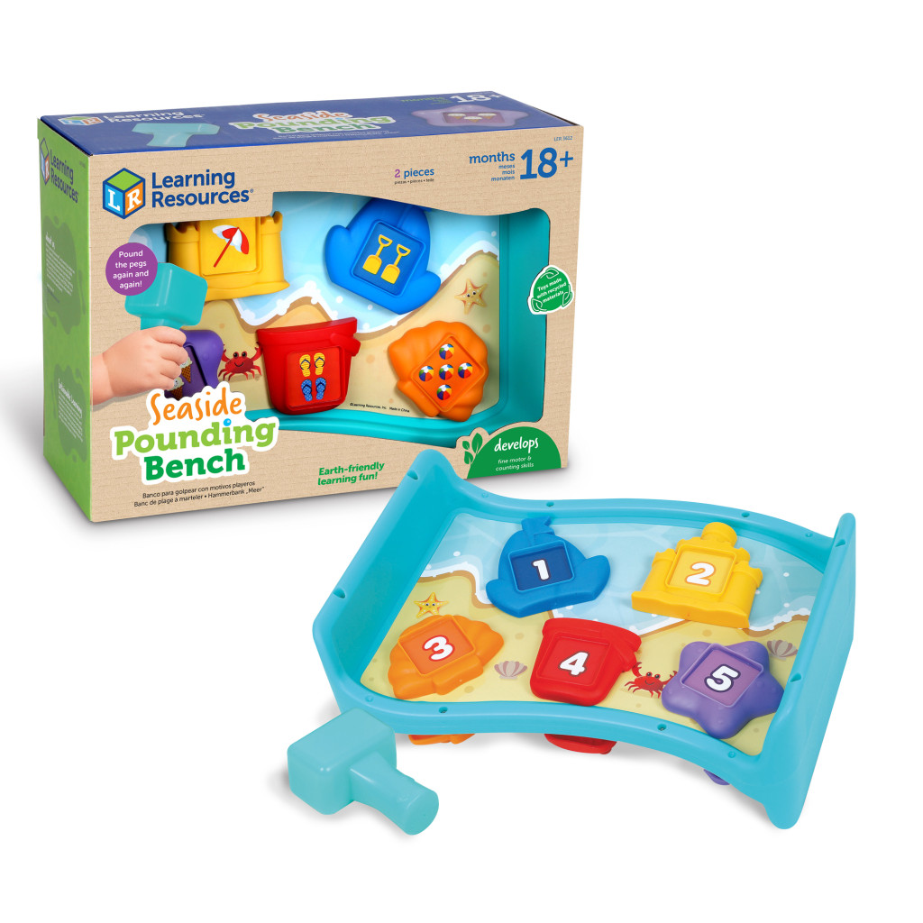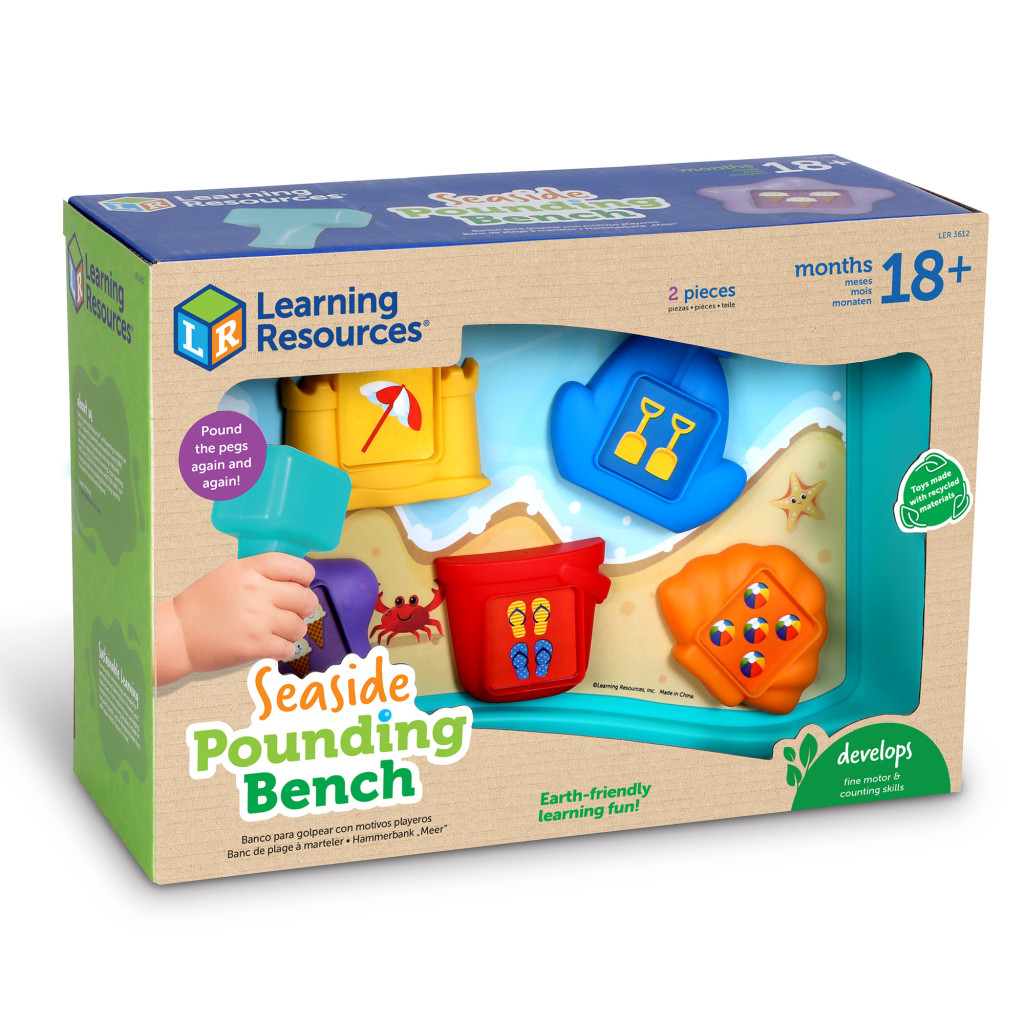 A Tengerparti Ütögetős Játék egy színes, tengerparti témájú játék, amely fejleszti a gyerekek kézügyességét, kéz-szem koordinációját és finommotorikáját. A gyerekbiztos kalapács segítségével az 5 tüskét ütögethetik át a padon, miközben a számok és a tengerparti tárgyak felismerését is gyakorolják. A játék visszafordítható, így többször játszható, és minden darab könnyen elérhető a padban.