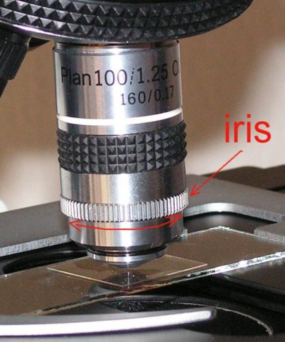 Univerzális Planobjektív (100x) iriszblendével sötéttérvizsgálathoz. Használható mind 160 mm-es, mind Zeiss és Lacerta Infinity rendszerhez.