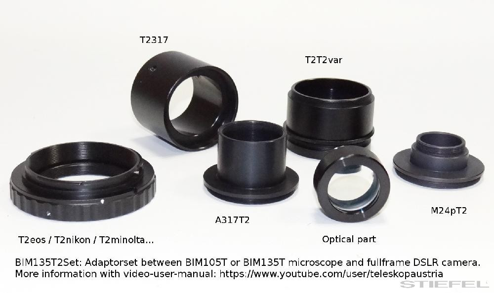 BIM105T/BIM135T fotoadapter szett Full-frame DSLR kamerához. A szett tagjai: A317T2, MicHel, MicHelT2, T2T26, M24pT2, optikai egység és egy STANDARD T2-DSLR Adapter.