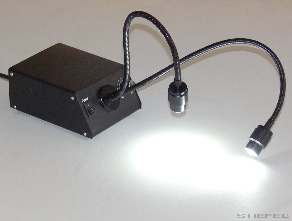 A dupla hattyúnyakas LED fényforrrás nagy előnye, hogy a fényforrás szöge és iránya, távolsága tetszőlegesen állítható, ami különösen fontos bizonyos vizsgálatoknál (pl. felületek érdessége, karcossága, stb). Fényereje igen erős és koncentrált, színhőmérséklete kellemes fehér (nem kékes, vagy sárgás). A fényerő szabályozható.