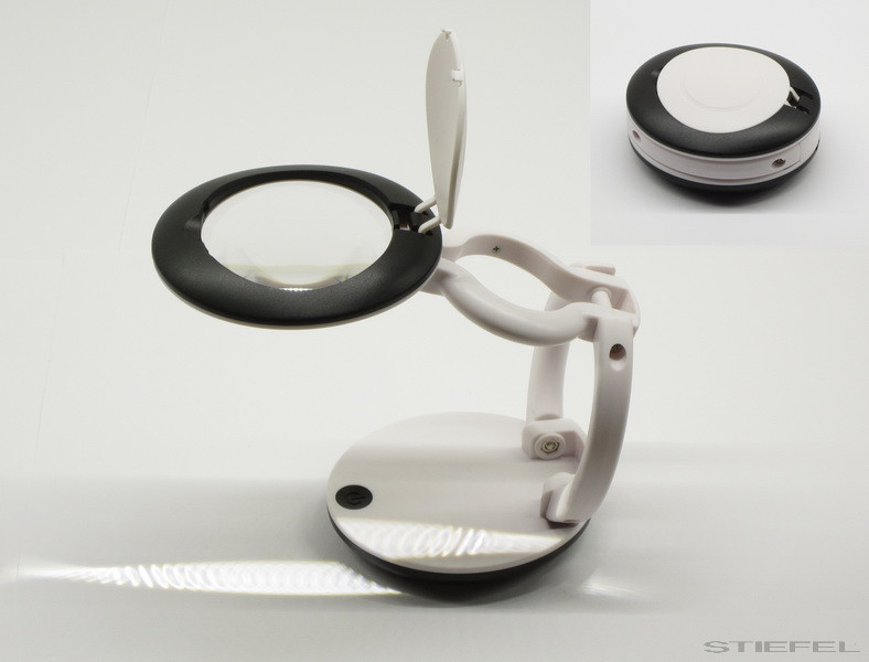 Egy ötletes szerkezetet építettek ennek a 60 mm-es lencsének (szabad nyílása 56 mm a foglalat miatt). Az állványt kihajtva 10-11 cm-es munkatávolságot kapunk, egy 75 mm-es asztalon helyezhetjük el a mintát. A jó látási viszonyokat a három beépített LED biztosítja, melyek az asztalt 1200 lux fényerővel világítják meg. A nagyító lencsét kihajtható kupak védi. Az áramellátást három AAA-s elem biztosítja (nem tartozék).