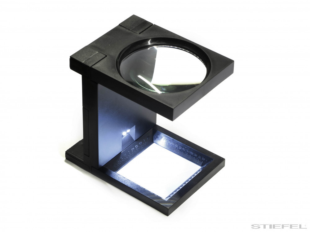 3x-os nagyítású, 90 mm-es lencsével rendelkező asztali nagyító, műanyag házzal, beépített LED világítással. A lencse üvegből készült, éles képet ad a céltárgyról. A talp alsó részén mm-beosztást találunk. Amikor nem használjuk, vagy amikor szállítjuk, a nagyító összecsukható, így kisebb helyet foglal.