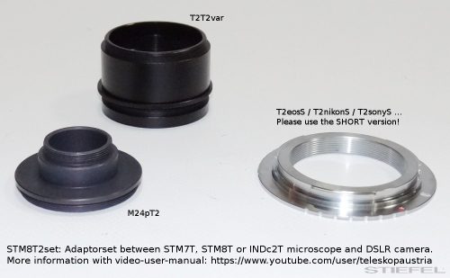 Fotoadapter-szett Full-frame DSLR kamerához. Szett tagjai: MikT2 vagy MikStT2, optikai egység, T2T2varS hosszabbító és egy Standard T2-DSLR Adapter.