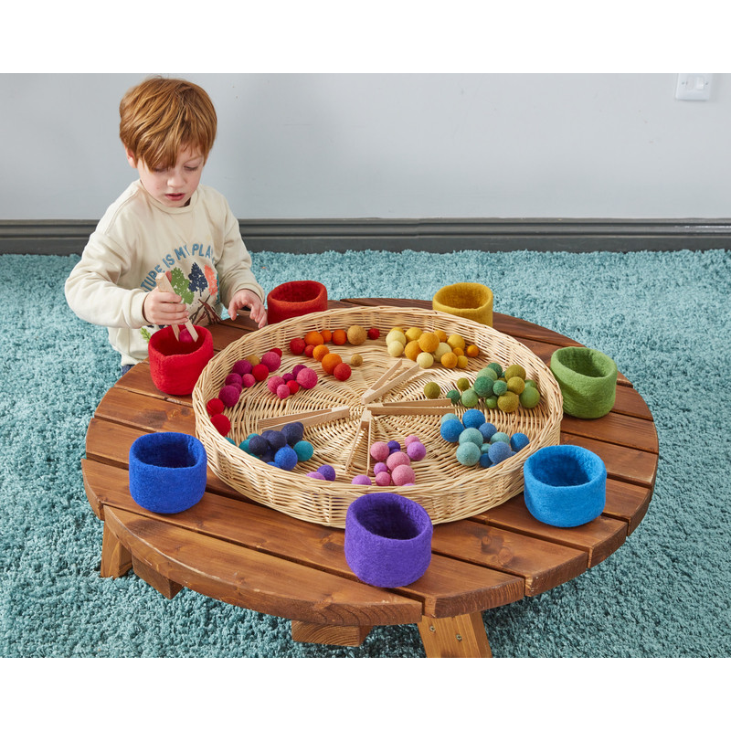 Színes Filckészlet színpompás, kézzel készült elemeivel természetes módon ösztönzi a gyerekeket a felfedezésre, a rendszerezésre és a játékos tanulásra. A hét színű tál és a 100 filcgolyó ideális eszköz a színfelismerés, a válogatás, a mintázatalkotás és a korai matematikai készségek fejlesztéséhez, miközben a gyerekek finommotorikája és kéz–szem koordinációja is fejlődik. A puha, tapintásra hívogató filcanyag biztonságos, szenzoros élményt nyújt, amely segíti a koncentrációt és a nyugodt, elmélyült játékot. A tálak és golyók mérete tökéletesen illeszkedik a kis kezekhez, így a gyerekek könnyedén tudnak pakolni, rendezni, építeni és kísérletezni velük. A szett sokoldalúan használható: kisvilág-játékokhoz, történetmeséléshez, korai matematikai feladatokhoz vagy szenzoros tálcás tevékenységekhez is kiváló. A természetes anyaghasználat és a tartós kialakítás hosszú távon is megbízható eszközzé teszi, amely támogatja a kreativitást, az önálló gondolkodást és a játékos tanulást minden környezetben.