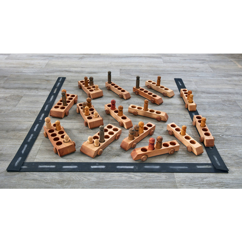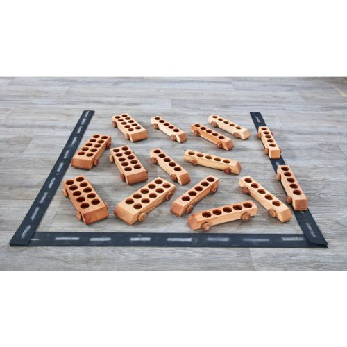 Ez a 15db-os járműves készlet játékos módon segíti a számolást, a tízes és ötös struktúrák megértését. A gyerekek sorba rendezhetik, parkolhatják vagy csoportosíthatják a járműveket, így természetes módon fejlődik a matematikai gondolkodásuk. A képen szereplő fa bábuk külön vásárolhatóak meg.
