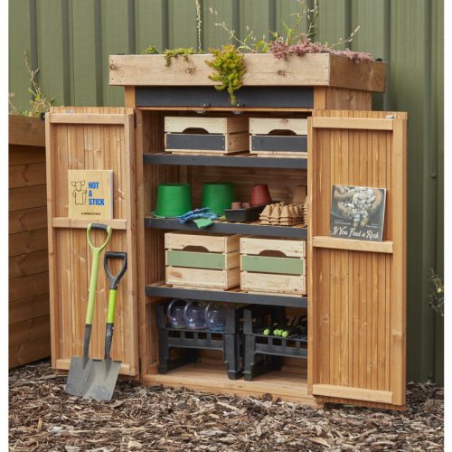 A Zöldtetős tárolóház egy igazi varázslatos találkozása a fenntarthatóságnak, a kreativitásnak és a kültéri tanulásnak — pontosan az a fajta inspiráló tér, amelyre minden modern intézmény vágyik. Ez a vibráló, élő tetős tároló nem csupán praktikus eszközök otthona, hanem egy olyan tanulási központ, amelyben a gyerekek felfedezhetik a természet működését, alkothatnak, kísérletezhetnek és szabadon kibontakoztathatják a fantáziájukat. A krétatáblás felületek ösztönzik a finommotorikus fejlődést és a vizuális gondolkodást, miközben természetes módon kapcsolják össze a játékot a tanulással. A belső tér tágas és könnyen hozzáférhető, így a gyerekek önállóan vehetik elő a tanulási eszközöket, ami erősíti az önállóságot, a felelősségérzetet és a tanulási folyamatba való aktív bevonódást. A strapabíró, időjárásálló kialakítás biztosítja, hogy a tároló megbízható társ legyen, bírja az esőt, a szelet, a napsütést és a mindennapi használatot. A legkülönlegesebb eleme azonban az élő tető, amely nemcsak gyönyörű látvány, hanem valódi ökológiai tanulási lehetőség is. A gyerekek megfigyelhetik a növények növekedését, gondozhatják a tetőt, megérthetik a természet körforgását és a fenntarthatóság alapelveit — mindezt játékos, élményszerű módon.
