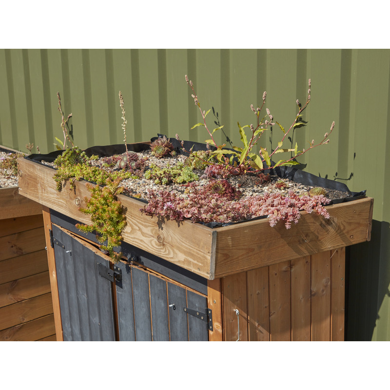 A zöldtetős tárolóház fenntartható, modern megoldás az udvari eszközök rendszerezett tárolására. A krétatáblás ajtók és polcok praktikusak, a zöldtető pedig természetközeli hangulatot teremt.
