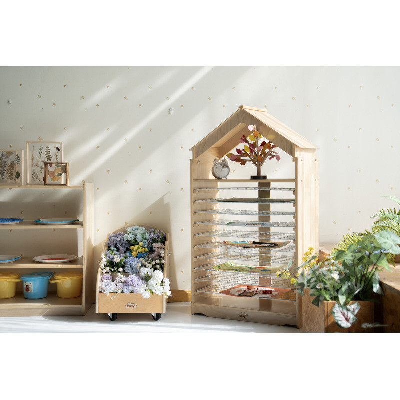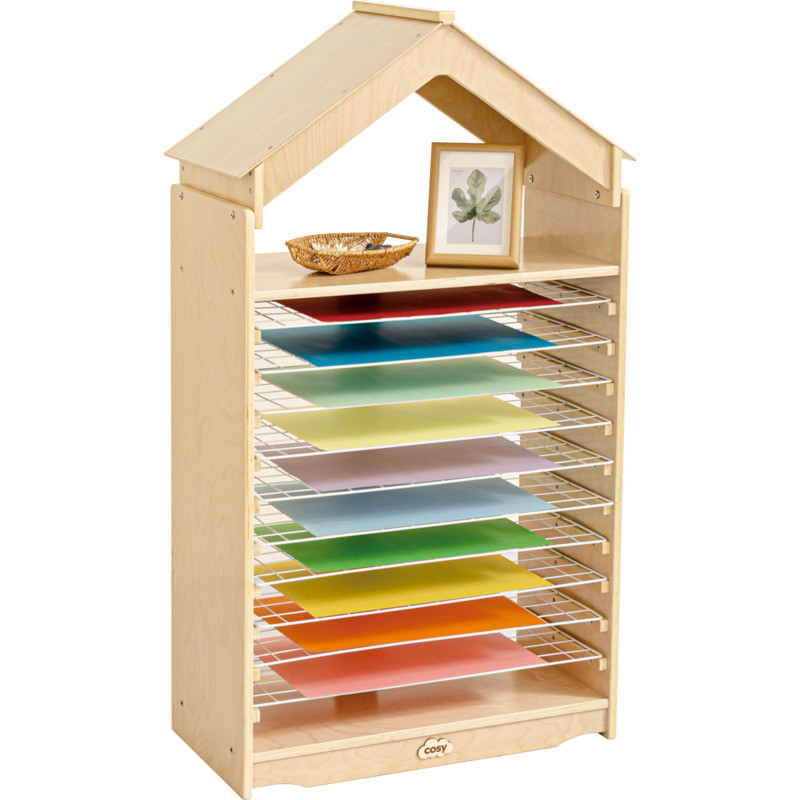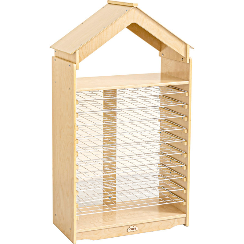 Ez egy igazán bájos, mégis rendkívül praktikus darab, amely tökéletesen illeszkedik minden óvodás és alsó tagozatos tanulókörnyezetbe. Masszív, időtálló kialakítása biztosítja, hogy hosszú éveken át megbízható társa legyen a mindennapi alkotótevékenységeknek, miközben a házikó formájú, oromtetős megjelenés barátságos, otthonos hangulatot teremt a csoportszobában. A szárítóház elöl és hátul teljesen nyitott, így a gyerekek könnyedén elhelyezhetik rajta a frissen készült műveiket, ami erősíti az önállóságot, a felelősségérzetet és a rendrakási szokások kialakulását. A tíz hófehér szárítórács bőséges helyet biztosít a festmények, kollázsok és egyéb alkotások szellős, biztonságos szárításához, miközben a tetején található polc tökéletes a kész művek kiállítására vagy a kreatív eszközök tárolására. A 121 cm magas, 66 cm hosszú és 33 cm mély kialakítás ideális arányokat kínál: elég kompakt ahhoz, hogy bármely tanulótérben elférjen, mégis elegendő kapacitást biztosít a csoport összes kis művészének.