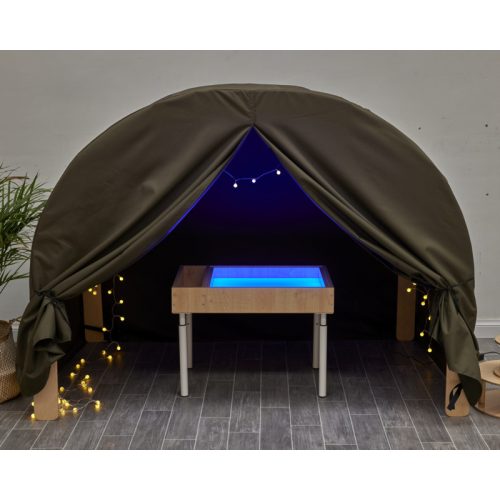Ez a sötét sátor egyetlen mozdulattal varázsolja át az Umbu ívet egy meghitt, sötét, szenzoros kuckóvá. Ez a praktikus, rugalmas huzat új dimenziót ad a már meglévő bútorodnak: egyszerűen csak ráhúzod az ívre, és máris egy teljesen új tanulási zóna születik, ahol a gyerekek elvonulhatnak, megnyugodhatnak vagy épp felfedezhetik a fények, árnyékok és textúrák világát. A könnyen nyújtható, strapabíró anyag biztosan a helyén marad, így a kis kezek nem tudják könnyen lehúzni. A sötét, fényzáró textil tökéletesen alkalmas arra, hogy egy meghitt, biztonságos, befelé figyelős teret hozz létre, ahol a gyerekek lelassulhatnak, beszélgethetnek vagy egyszerűen csak megpihenhetnek. A huzat azonban nemcsak pihenőkuckóként működik: pillanatok alatt alakíthatod át szenzoros sátorrá, fényjátékos térként használhatod. Ez egy sokoldalú, költséghatékony kiegészítő, amely új életet lehel a meglévő bútorba, miközben támogatja a szenzoros játékot, a szerepjátékot, a nyugodt beszélgetéseket és a meghitt tanulási pillanatokat. A gyerekek számára egy olyan tér születik, ahol biztonságban érzik magukat, ahol elmélyülhetnek, és ahol a fantáziájuk szabadon szárnyalhat.