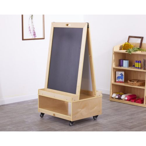 Kompakt, kétoldalas (mágneses és krétatábla) mozgatható tábla, praktikus tárolópolcokkal és fékezhető kerekekkel. Tökéletes a kreativitás, közös alkotás támogatásához és történetmeséléshez. Mérete: (ma)127.5 x (sz)68 x (mé)54.5cm