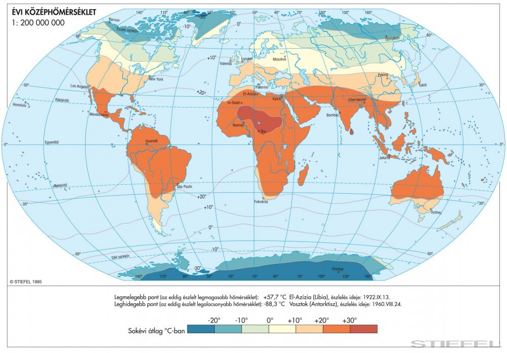 Részletes iskolai falitérkép, amely bemutatja a Földön jellemző évi középhőmérséklet alakulását.
