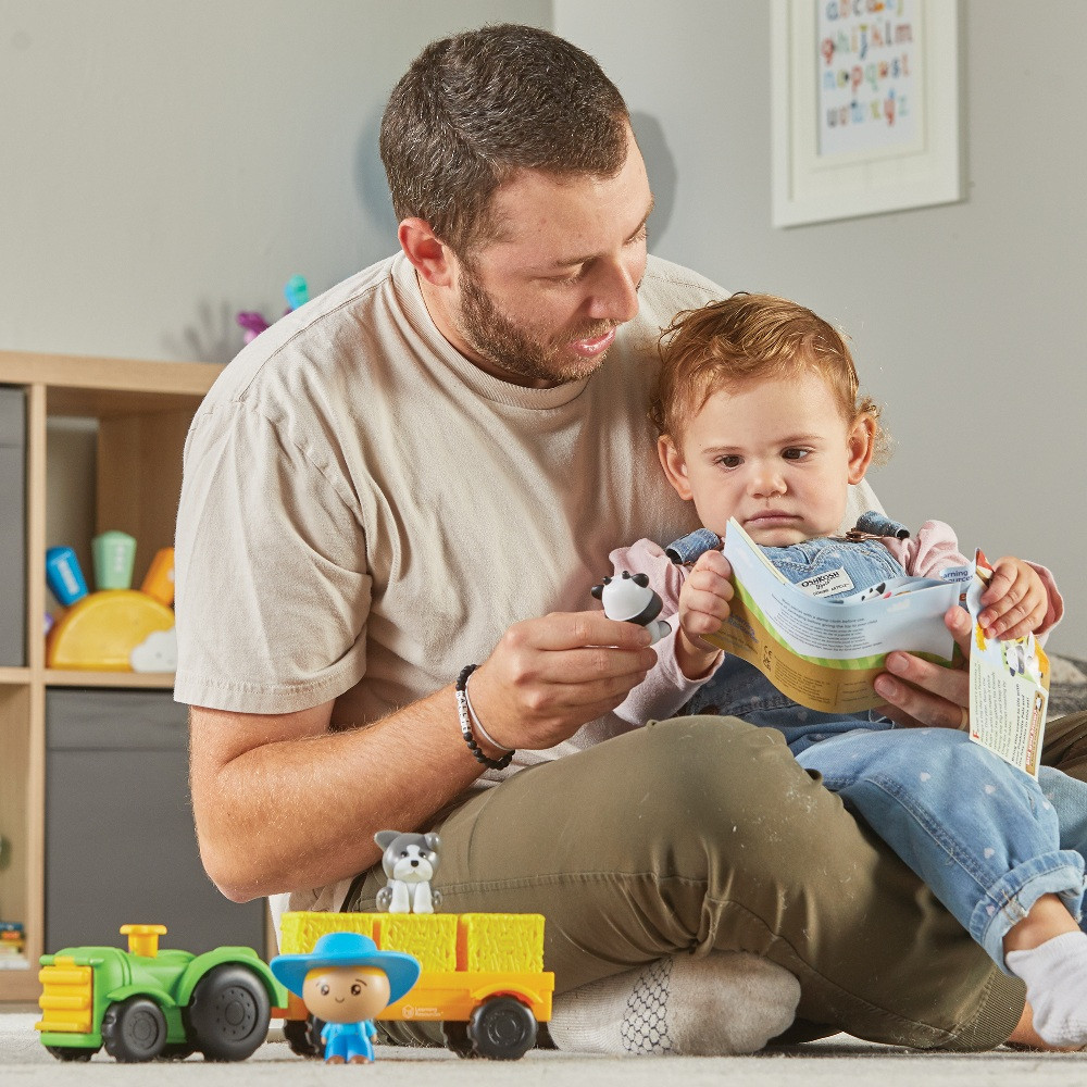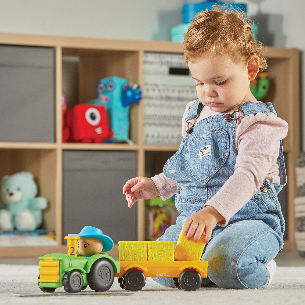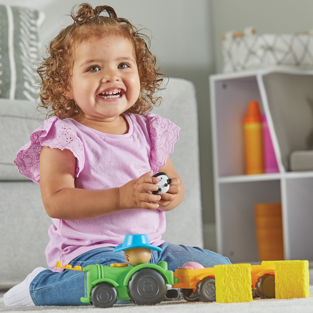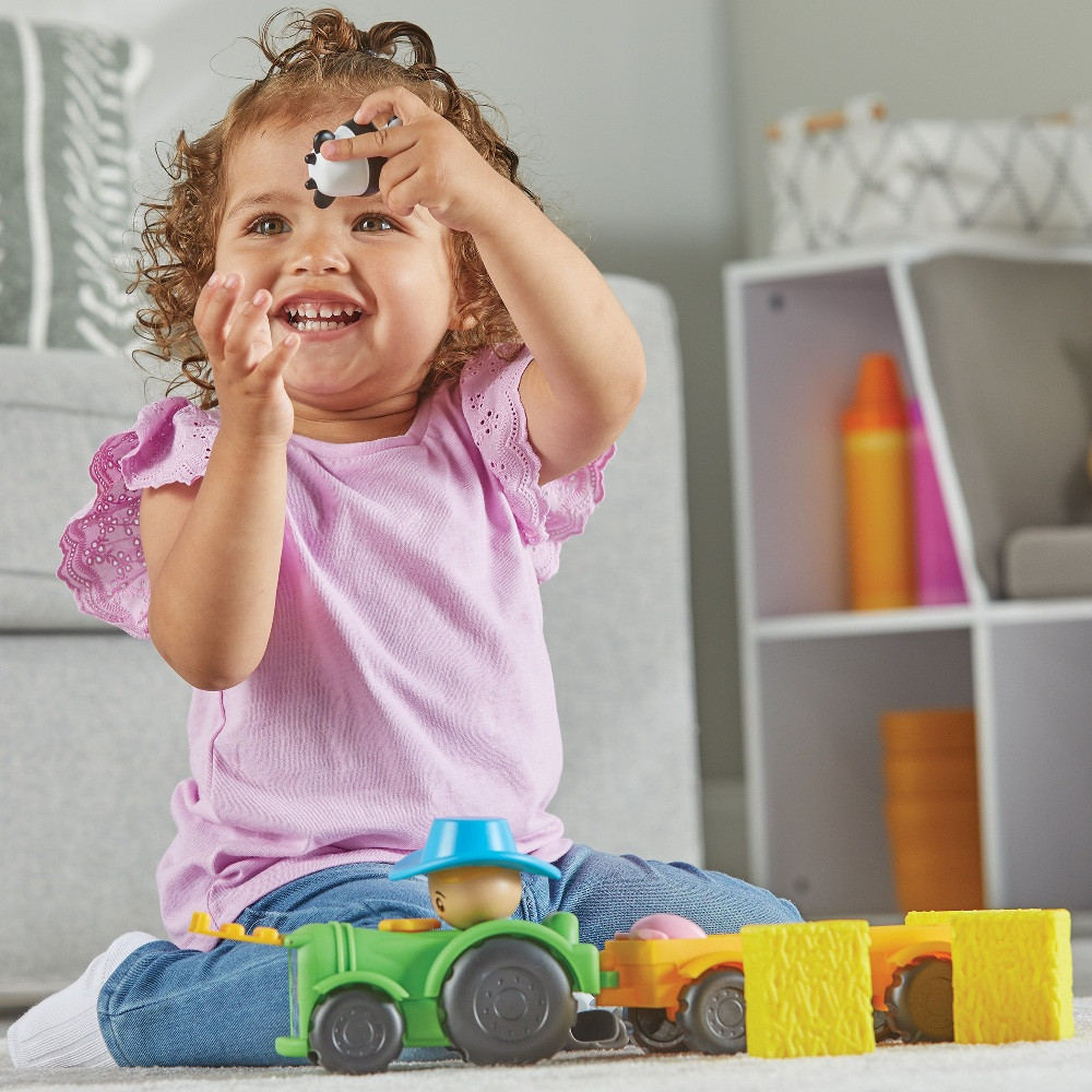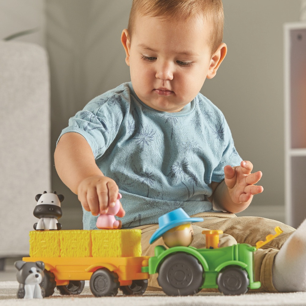A kicsik elrejthetik a farmállatokat a szénabálák alá, majd megkereshetik őket – így játékosan gyakorolják a megfigyelést és a memóriát. Ha pedig eljött a szállítás ideje, csak tegyék az állatokat az utánfutóra, és indulhat a traktoros túra a farmon!