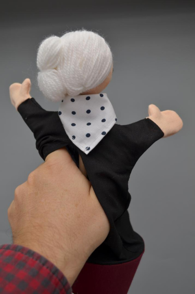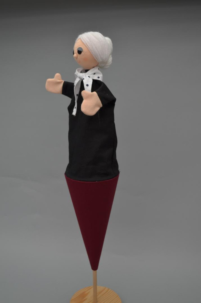 A „3 az 1-ben” felugró báb = egy felugró báb + egy kézbáb + egy apróságok tárolására szolgáló tok. Egy fapálcával irányítható, amellyel a figura egy kúpba rejthető. A hátoldalán nyílás található, ahová be lehet dugni az ujjakat (mint egy kézbábnál), vagy kisebb ajándékok helyezhetők bele. Csak a felületét tisztítsa. Kézzel készült a Cseh Köztársaságban.