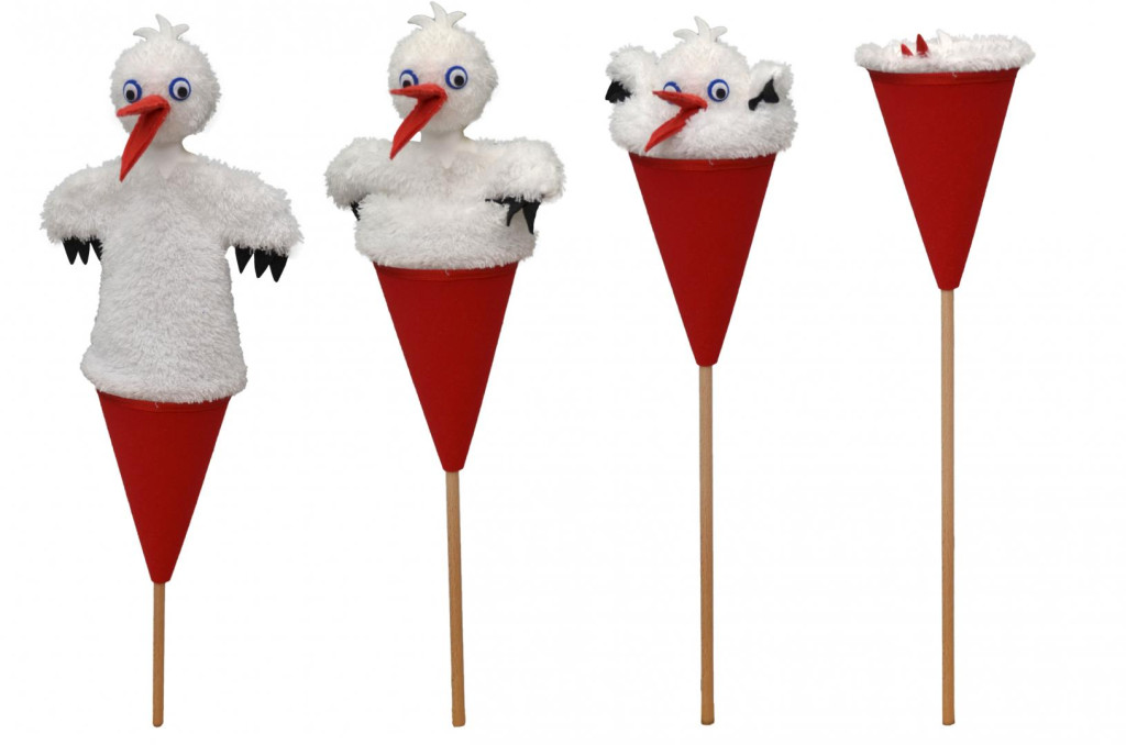 Textilből készült felugró báb, amelyet egy fapálcával lehet irányítani, így az egész figura egy kúpba rejthető. A pop-up báb játékra és dekorációként is használható. Csak a felületét tisztítsa. Kézzel készült a Cseh Köztársaságban.
