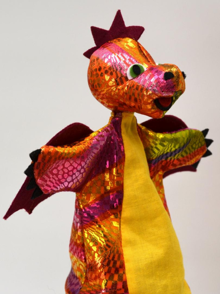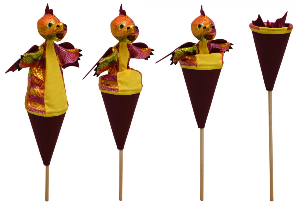 Textilből készült felugró báb, amelyet egy fapálcával lehet irányítani, így az egész figura egy kúpba rejthető. A pop-up báb játékra és dekorációként is használható. Csak a felületét tisztítsa. Kézzel készült a Cseh Köztársaságban.