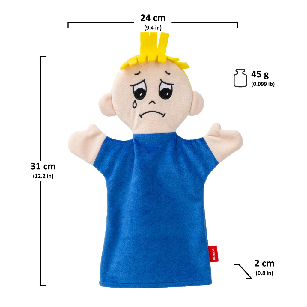 Textil kézbáb, amely érzelmet jeleníti meg. Alkalmas pszichológiai tanácsadáshoz, gyógypedagógusoknak, óvodapedagógusoknak, gyermekcsoportoknak, intézményi és otthoni játékhoz egyaránt. Természetes anyagokból készült. Az arca hímzett, a feje puhán tömött, és az egész bábu nagyon kellemes tapintású. Mosható. Mérete kb. 30 cm. Kézzel készült Csehországban.