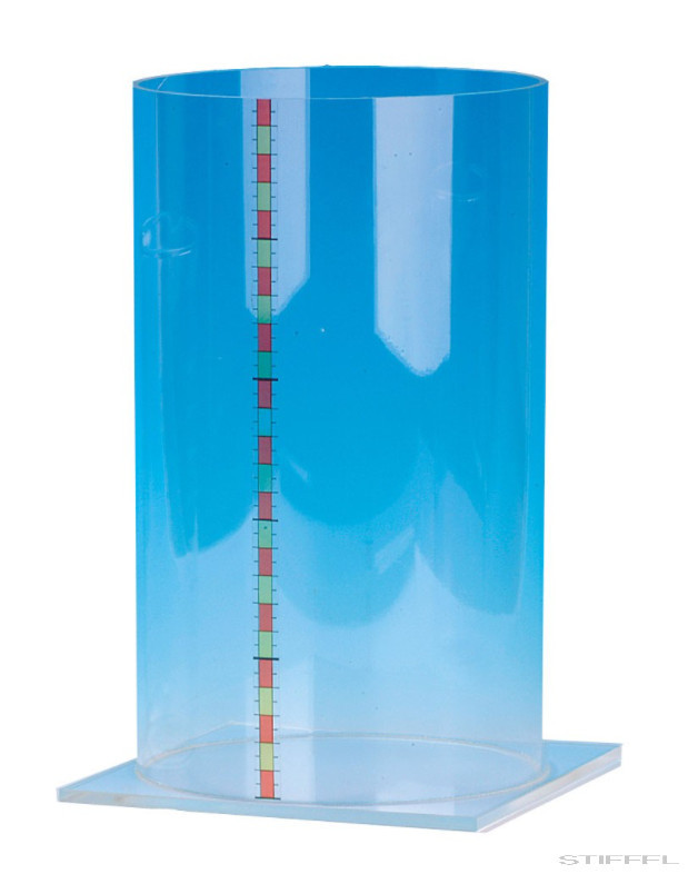 Akril henger talppal és átlátszó skálával, víztartályként használható hidromechanikai kísérletekhez. Átmérő: 150 mm, magasság: 250 mm.