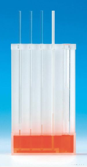 • 4 különböző belső átmérőjű üvegcső fehér hátfalú akrilüveg tartályban.