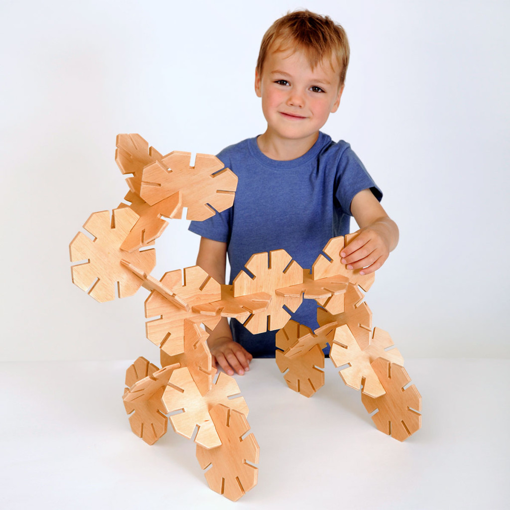 A nyolcszög alakú fa elemek különlegesek: könnyen egymásra helyezhetők, és az elkészült építmények önállóan megállnak, így az építés gyors sikerélményt ad. Az elemek kellemes tapintású, kiváló minőségű rétegelt lemezből készültek, méretük 12 × 12 cm, vastagságuk 6 mm, ami tökéletes a kisebb kezek számára.
