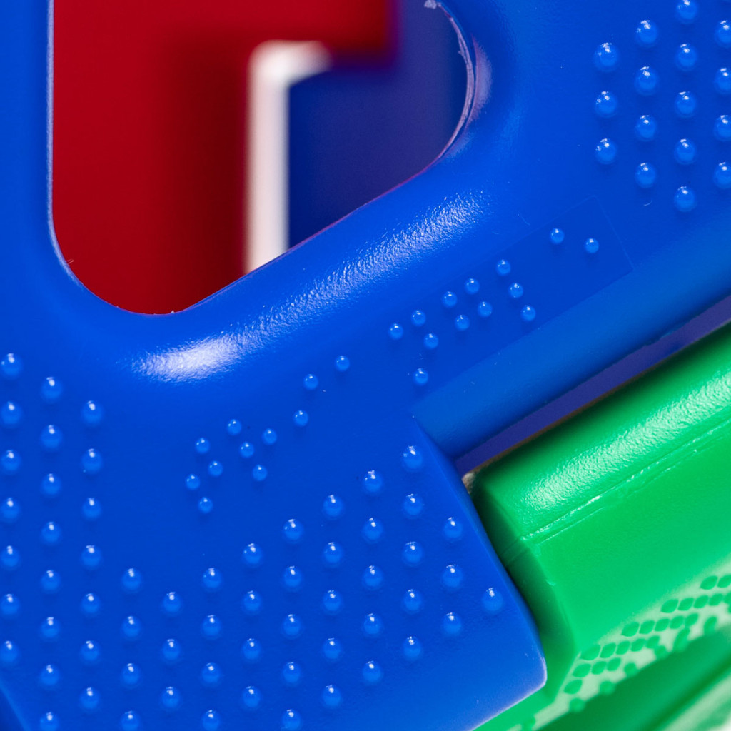 A texturált felületek tapintásra is élményt nyújtanak, a készlet Braille-jelöléseket is tartalmaz, így még több gyermek számára hozzáférhető. Az elemek összekapcsolása egyszerű és gyors, ami önálló építésre is lehetőséget ad. A játék segíti a térbeli tájékozódás és a mozgáskoordináció fejlődését.