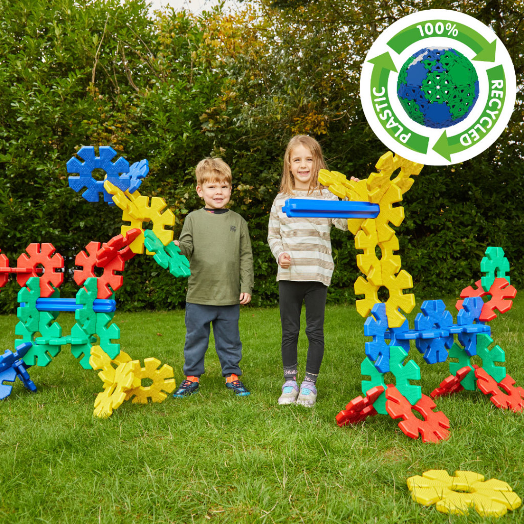 Az Óriás Octoplay készlet ideális bölcsődéknek, óvodásoknak és kisiskolásoknak, hogy kreatív 2D és 3D modellek játékos építéséhez. A készlet 42 nagyméretű, 24 cm-es elemet tartalmaz 4 színben, valamint 2 tároló rudat, amelyek a játék részeként is használhatók. A tartós, könnyű és tapintható darabok beltéren és kültéren egyaránt használhatók, így akár nagyobb modellek vagy több kisebb modell építése is lehetséges.