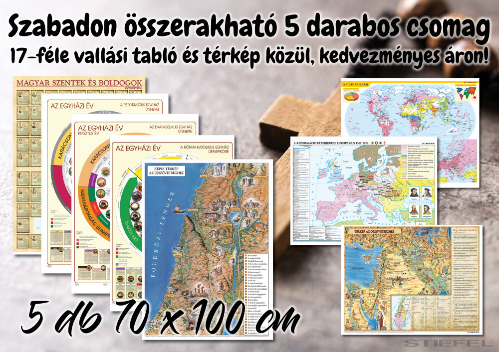 Tetszőlegesen összerakható 5 darabos akciós csomag 17-féle vallási, iskolai oktatótabló és térkép közül, 70 x 100 cm / db méretben.