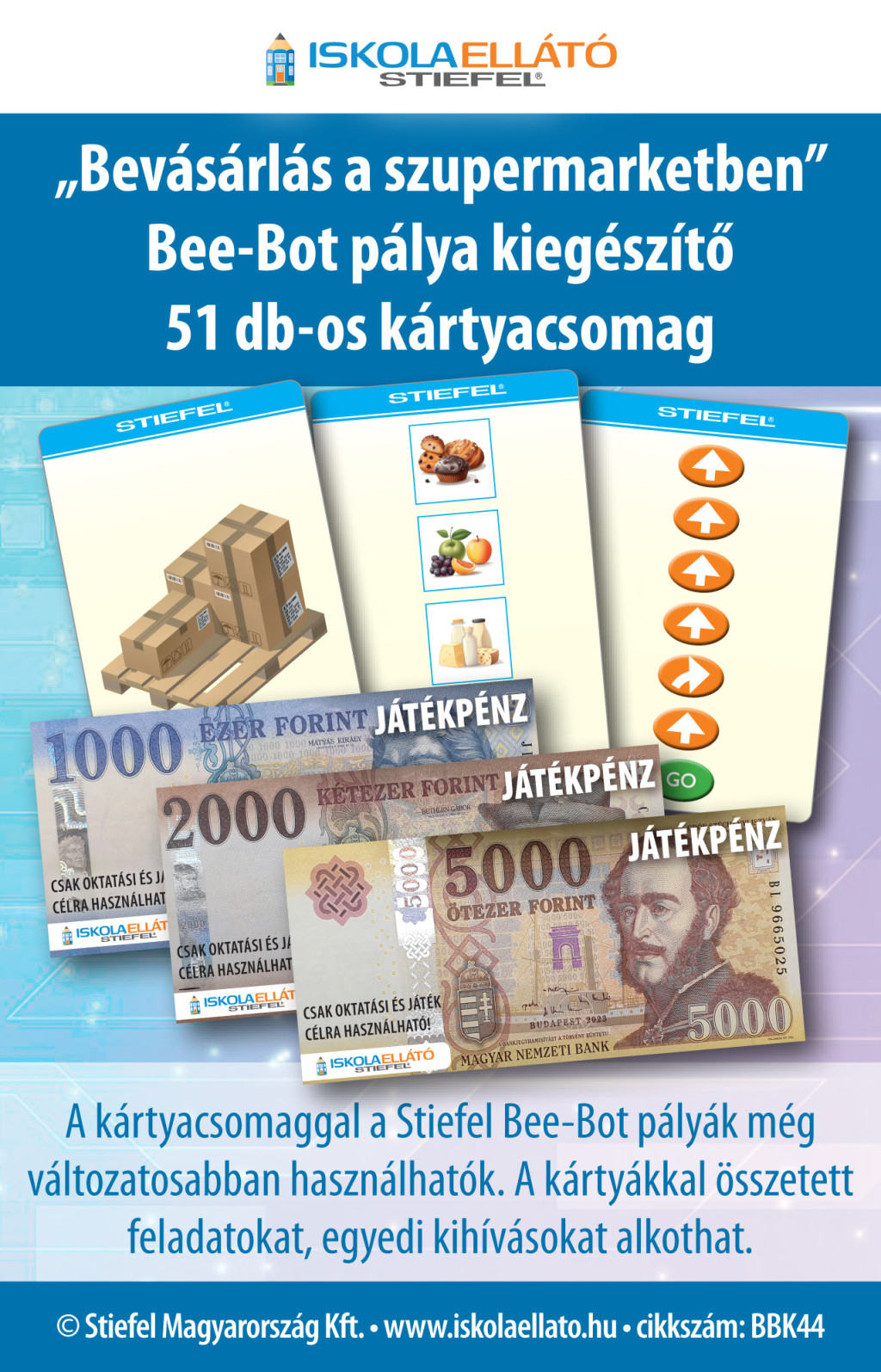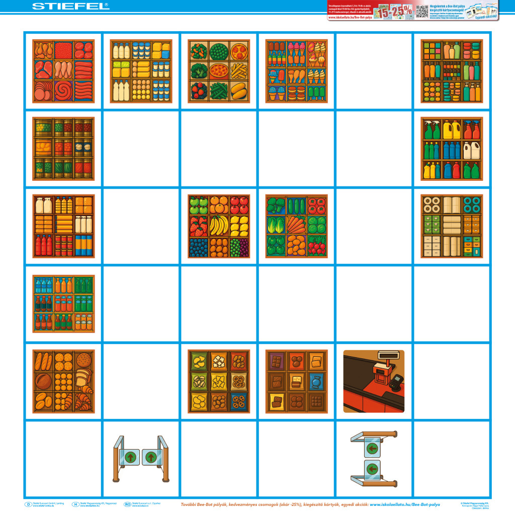 Ez az első pályánk, amelyhez komplex kártyacsomag is tartozik, így nemcsak a programozás, hanem a logikai gondolkodás, számolás és mindennapi helyzetek gyakorlása is előtérbe kerül. A pénztármezőn a tanulók fizethetnek a termékekért, és a pénztáros akár vissza is adhat! Nagyszerű eszköz a pénzkezelés játékos gyakorlására.