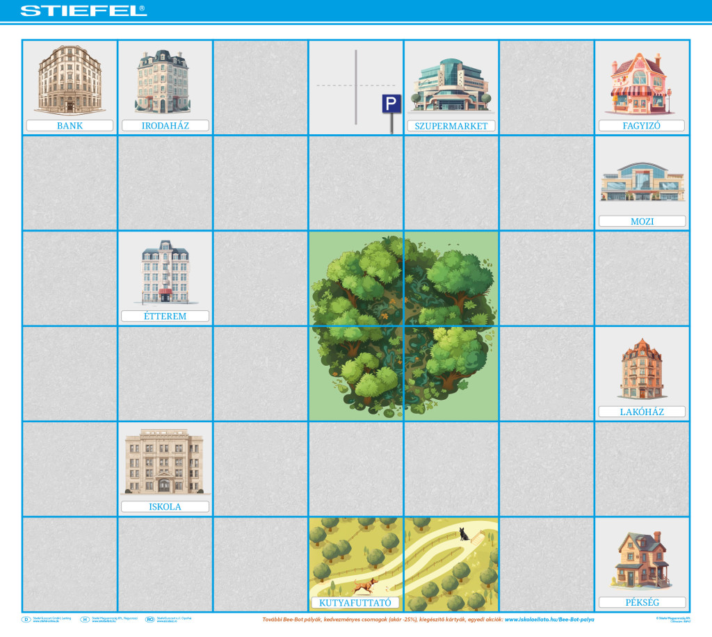 Ebben a Bee-Bot pályában nincsenek fixen elhelyezett gyalogos-átkelőhelyek és közlekedési táblák – helyettük kártyák és műanyagtalpak segítségével tetszőlegesen alakíthatóak ki. Így minden óra más és más feladatot hozhat, a tanulók pedig saját városi közlekedést építhetnek, miközben megtanulják a közlekedési szabályokat.