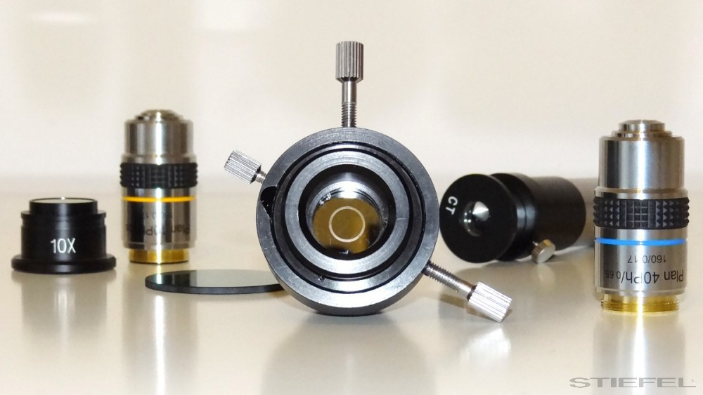 • A fáziskontraszt szett a fáziskontraszt-kondenzorból, valamint 4 objektívből és a hozzá tartozó 4 gyűrű-diafragmából áll.