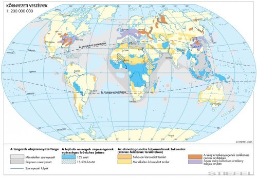 Részletes iskolai falitérkép, amely bemutatja a Földet érintő környezeti veszélyeket.
