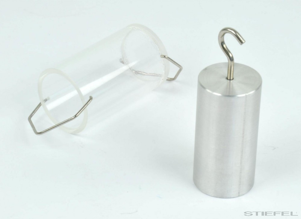 Akril henger két fém fogantyúval és egy illeszkedő fém henger kampóval, D = 32 mm, H = 62.25 mm. Súly: 50 g.