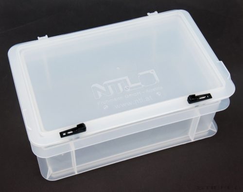 Az NTL tárolódoboz fedele a két csúszka segítségével teljesen lezárható, így a készülékek, készletek hosszú ideig biztonságosan és pormentesen tárolhatók.